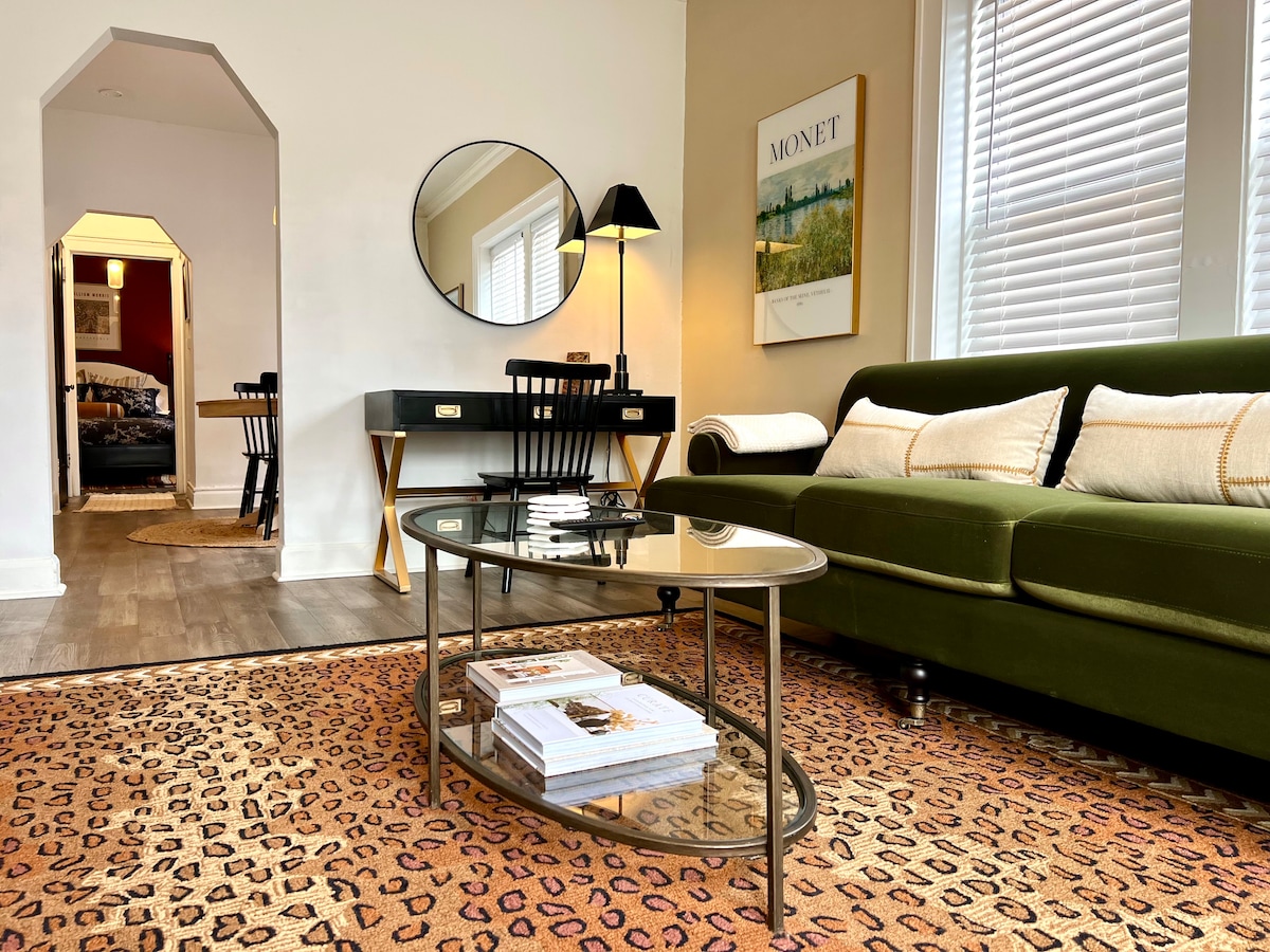 Espacio de diseño hecho. Una acogedora sala de estar con sofás dobles, área para trabajar con un escritorio y una silla. Un dormitorio con una cama tamaño queen, ropa de cama de lujo y cortinas opacas para ayudarte a dormir tranquilamente por las noches. Cocina con nevera de tamaño completo, estufa a gas, microondas, cafetera Keurig, tostadora. Mesa de comedor con asientos para cuatro personas. A 11 minutos en auto de la Clínica Cleveland, Hospitales Universitarios y Case Western Reserve. Museo de Arte de Cleveland, del Jardín Botánico de Cleveland y del centro de Cleveland. A pie del segundo piso.